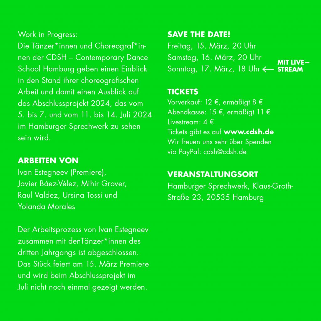 Choreografien von Javier Báez, Mihir Vipin Grover, Ursina Tossi und Yolanda Morales. Die Tänzeri*nnen des dritten Ausbildungsjahrs zeigen zudem die Premiere ihrer ersten Abschlusschoreografie, die sie zusammen mit Ivan Estegneev erarbeitet haben.